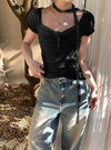 首元が広く開いたスクエアネックでデコルテを綺麗に見せ、大人の余裕を持たせる。
