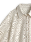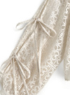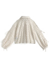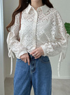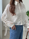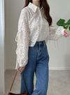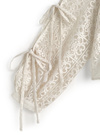 レースの華やかさとエアリーな雰囲気が絶妙に融合したデザインのブラウス。スリーブにはカッティングが施され、リボンで調整するディテールが印象的。