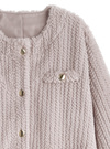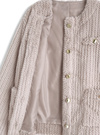 すっきりとしたノーカラーデザインやゴールドボタンが、上品な雰囲気を演出するポイント。