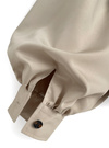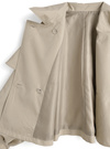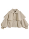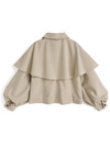 つるっとした質感が特徴の軽やかな生地を使用したトレンチコート。ポンチョライクなケープデザインがフェミニンな印象を与えるポイント。