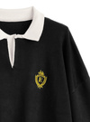 配色のスキッパーデザインがマニッシュな印象を与えるトップス。胸元にあしらったエンブレム風の刺繍がクラシカルなワンポイント。
