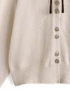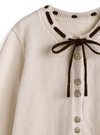 ネックラインに通したリボンが程よい甘さを添えるニットカーディガン。上品に輝くゴールドボタンもアクセントとなり、シンプルながらも洗練された印象に。