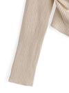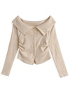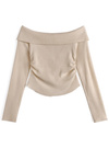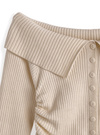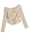 大きめカラーが顔まわりを華やかな印象に演出するニットトップス。伸縮性のある柔らかな素材なので、オフショルやワンショルでも着られる。