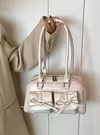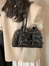 つるんとした光沢感のエナメル調素材が魅力のボストンバッグ。フロントにあしらったリボン付きポケットがキュートなアクセント。