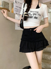 フリンジ加工がラフさを高め、ヴィンテージライクな仕上がりのミニスカート。ボリュームのあるティアードフリルが揺れるたびに表情を変える。
