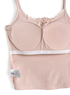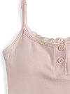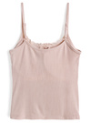 柔らかく伸びの良いリブ素材で優しい着用感のキャミソール。胸元にはレースやフェイクボタンをあしらい、デザイン性を高めた。