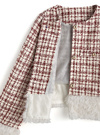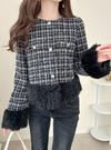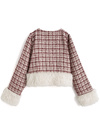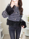キラッと輝くラメ糸を織り込んだ上品な雰囲気漂うツイードジャケット。裾や袖口にエコファーをドッキングすることで、華やかさをプラスしたデザイン。