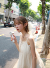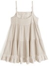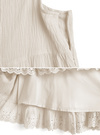 裾のアイレットレースが愛らしい、やわらかな風合いのキャミワンピース。胸元にはリボンや小さなボタンをあしらい、ガーリーな表情を生み出す。