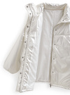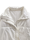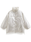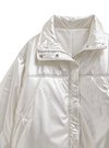 光沢感のあるシャイニーナイロン素材が目を引くジャケット。ジップアップを上まで閉めれば、首元まですっぽりあたたか。