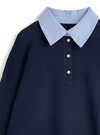 程よい厚みのニット素材を用いても、ドッキング仕様なので着膨れしにくいトップス。襟とカフスを切り替え、シャツを重ね着したような仕上がりに。