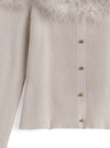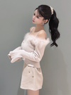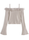 ふわふわのフェザーファーをデコルテまわりにあしらい、華やかな印象に仕上げたオフショルトップス。