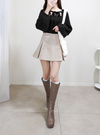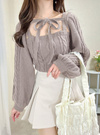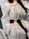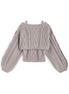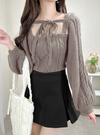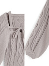ふんわりと立体的に編まれたケーブルニットのアンサンブルが登場。ボレロのリボンディテールやボリュームスリーブが女性らしさを引き立てる。