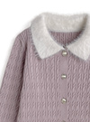 立体的に編まれた細かなケーブル柄が特徴のニットカーディガン。顔まわりを華やかに演出するふわふわのシャギーカラーにキュンとする。