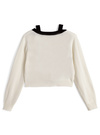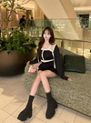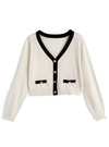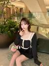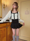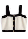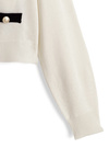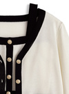配色のコントラストが目を惹く、上品でエレガントなアンサンブル。フロントに並んだゴールドボタンが華やかさを添えるポイント。