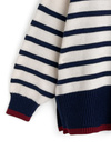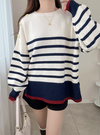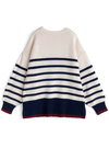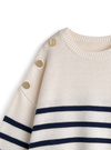 洗練された印象を与えるボーダー柄のニットプルオーバー。肩のゴールドボタンがアクセントで、カジュアルながら上品に着こなせるデザイン。
