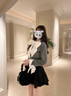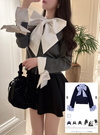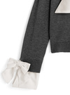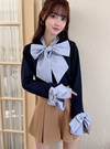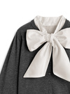 ボウタイブラウスとニットカーデを組み合わせたようなレイヤード風トップス。袖部分には立体的なリボンモチーフをあしらい、フェミニンムードたっぷりに仕上げた。