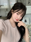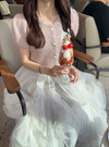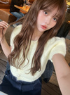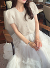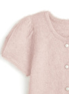 毛足のあるウール混ニット素材で仕立てたカーディガンは、ふんわりとした触り心地。大きく開いたネックとふくらみのあるパフスリーブが、女性らしさを引き出す。