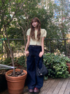 フロントにはパール調ボタンをあしらい、エレガントなニュアンスを添える。