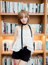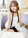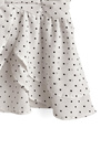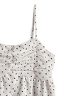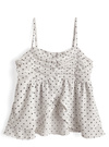 ギャザーをたっぷりと入れた立体感のあるドット柄のキャミソールが登場。お腹がチラ見えする段差をつけたヘムラインがこなれ感を演出。