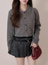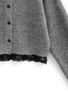滑らかな質感のニット素材で仕立てたカーディガンは、上品な印象を与える。裾部分にあしらわれたレースがフェミニンなディテールを強調する。