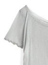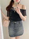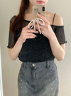 片方だけ肩出しでさりげない抜け感あるデザインのトップス。全体に細かくラメが入ってて、さりげなくキラッと光るのがポイント。