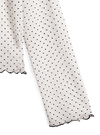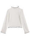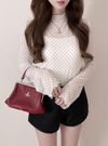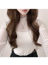 シアー素材にフロッキーの細かい水玉柄をあしらったトップス。首元や裾などをメロウ加工にすることによりフェミニン要素をプラス。