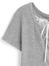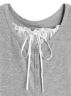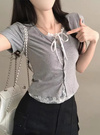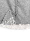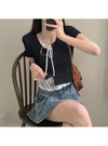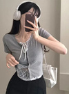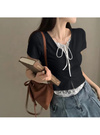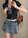胸元や裾からレースがチラ見えするガーリーなレイヤード風トップス。フロントには華奢なリボンをあしらい、さり気ない甘さをプラス。