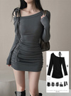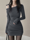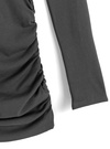 サイドに寄せたドロストギャザーが立体感を生み、腰回りをすっきりと演出する。