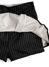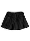ツヤのある生地にマニッシュなピンストライプ柄をのせたミニスカート。裾にかけて広がるボックスプリーツが動きのあるシルエットに。