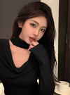 自然なドレープ感がフェミニンな雰囲気を漂わせるトップス。首元のチョーカー風デザインが、色っぽいアクセントを添える。