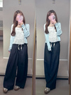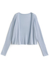 軽やかなリブ素材のカーディガンとキャミソールのアンサンブル。カーデはあえてボタンをなくし、すっきりと着られるデザインに。