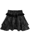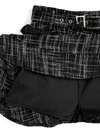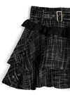 柔らかなツイード調生地を使用した、ティアードデザインのミニスカート。レースフリルや両サイドにあしらったリボンモチーフが甘さを添える。