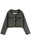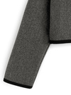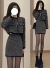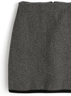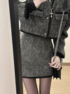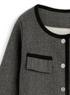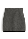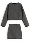 ウールライクな生地感が魅力的な、ジャケットとスカートのセットアップ。配色のライン使いがメリハリのあるアクセントに。
