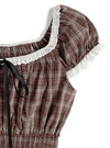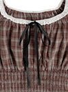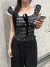 チャック柄生地と細かいレースディテールがレトロガーリーな雰囲気。胸元にサテンリボンを添え、さらに甘さを加えた女の子っぽデザイン。