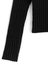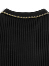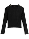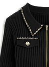 凸凹感のあるリブニットで仕立て、洗練された印象に。襟まわりと胸元にあしらったゴールドチェーンが、リッチさを引き立てる。