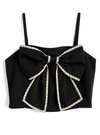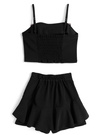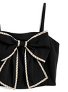 さらりとした風合いの生地で仕立てた、ビスチェとスカパンのセットアップ。キャミはチェック柄生地がパイピングされた大きなリボンが視線を集めるポイント。