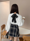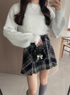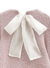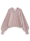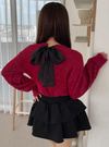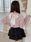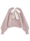 ソフトな肌触りのシャギーニットにラメ糸を交ぜ、繊細な輝きを添える。背中には光沢のあるシアーリボンが施され、好みのアレンジで結べる仕様。