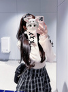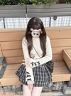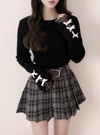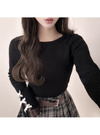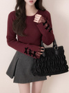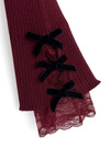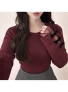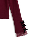 袖口にあしらわれた上品な装飾が手元を華やかに演出するトップス。繊細なレースや配色のベロアリボンがこだわりポイント。