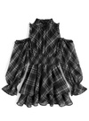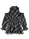 柔らかく軽やかな素材が上品な印象を与えるチェック柄ワンピース。肌がチラッと見える肩開きデザインで、女性らしさをさらに際立たせる。