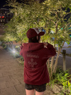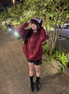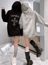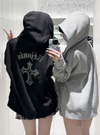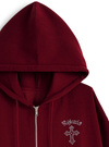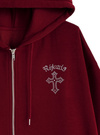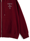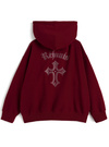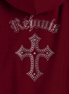 クールなクロスモチーフを胸元とバックにあしらったスウェットパーカー。キラキラのラインストーンで表現することで、華やかな印象に仕上げた。