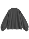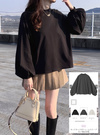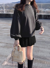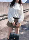 体をゆったりと包み込むオーバーシルエットのTシャツ。ふっくらとしたボリュームスリーブが女性らしさを引き立てる。