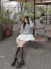 ガーリーなミニスカートにも、カジュアルなパンツ合わせもおすすめの一着。