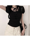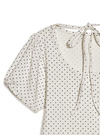 クラシカルな水玉柄プリントあしらったコーデのポイントになるトップス。首元にあしらったタイのようなリボンが甘さを添えるアクセント。