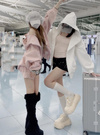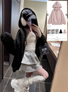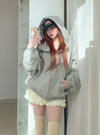 高さのある大きめフードが顔まわりを包み込み、小顔効果も期待できる。