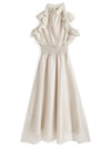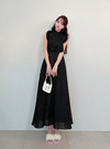 上品で繊細なシアー素材を使ったエレガントな雰囲気のワンピース。肩まわりを大胆に見せるアメリカンスリーブが女性らしさを引き立てる。