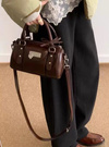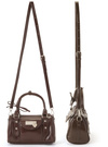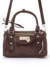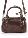 ツヤのあるフェイクレザーに丸みのあるボストンフォルムのバッグ。フロントポケットにはシルバープレートと揺れ動くハートモチーフを飾りアクセントに。