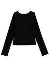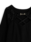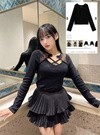 胸元のクロスデザインが大人の色っぽさを漂わせるトップス。ゴールドのビットパーツやレース使いが顔まわりを華やかに演出。