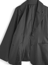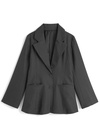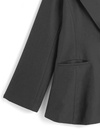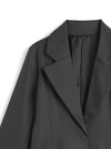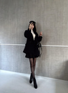 しっかりとしたハリのあるツイル生地で仕立てたジャケットとミニスカートのセットアップ。テーラードカラーがマニッシュな印象を与えつつ、ややシェイプされたウエストシルエットが女性らしさを引き立てる。