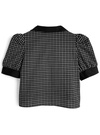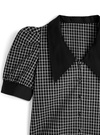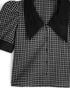 クラシカルな細かいチェック柄生地で仕立てた品のあるブラウス。シャープで大きめの襟デザインが顔まわりを華やかに印象付ける。
