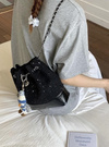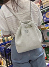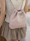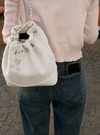 上品なツイード生地を使用したフェミニンな雰囲気漂う巾着リュック。丸みのあるフォルムや、ゆらゆら揺れるハートモチーフチャームが女性らしさを引き立てる。